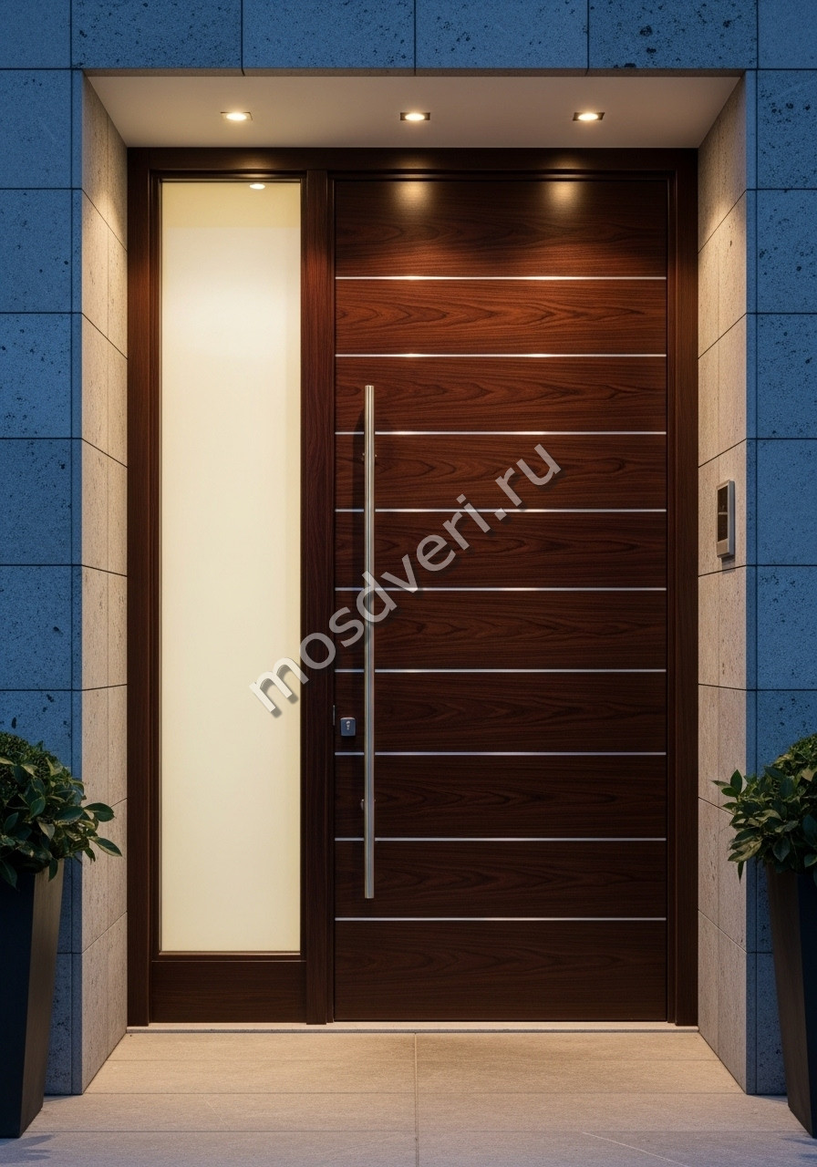 Входные двери больших размеров изготавливаются с терморазрывом, что обеспечивает отличную теплоизоляцию помещения. Внутренняя отделка выполняется различными панелями — от классических деревянных до современных с зеркалом или стеклом. Внешняя сторона может иметь порошковое покрытие любого цвета или декоративные вставки.